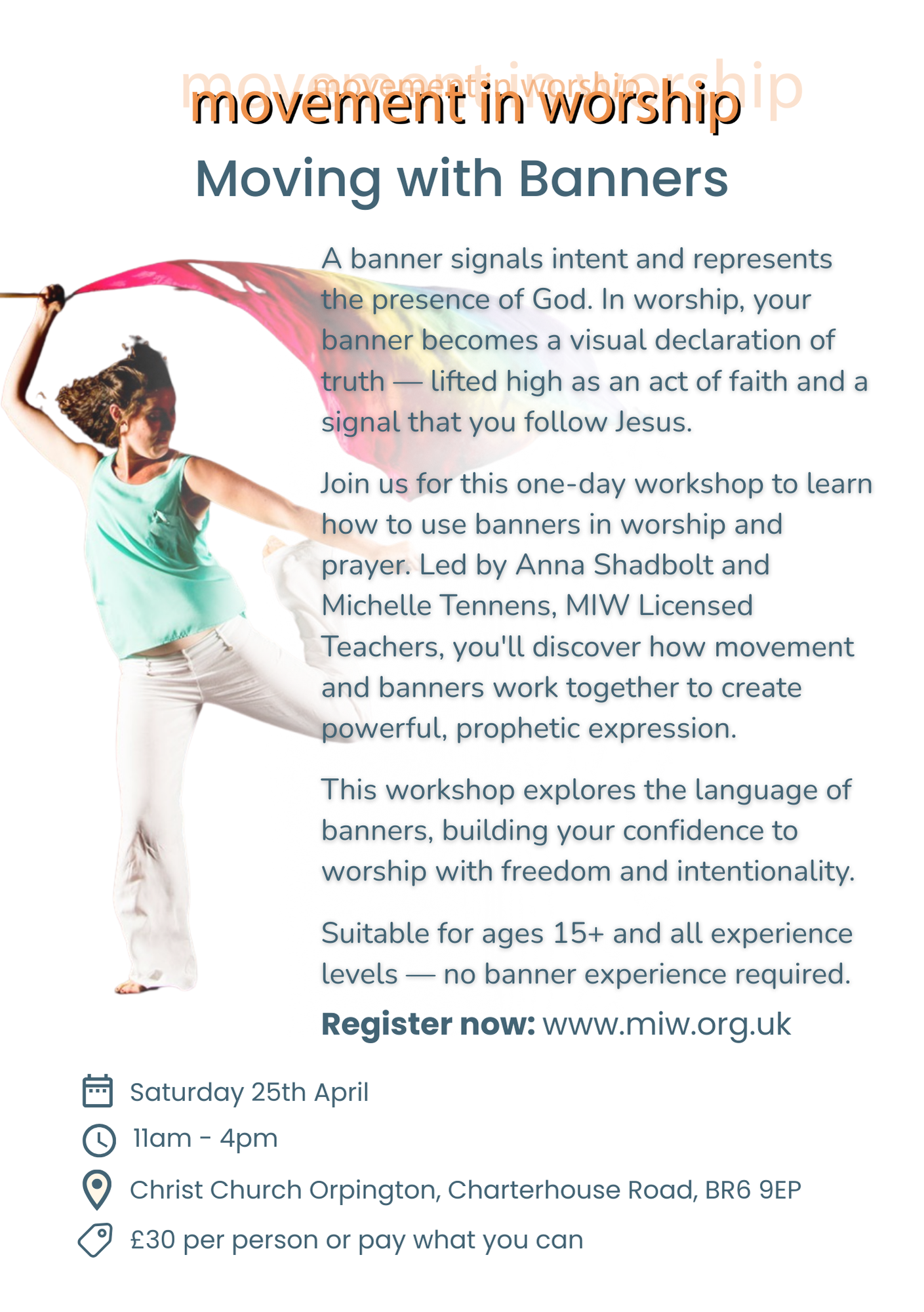 Join us for this one-day workshop to learn how to use banners in worship and prayer. Led by Anna Shadbolt and Michelle Tennens, MIW Licensed Teachers, you’ll discover how movement and banners work together to create powerful, prophetic expression.